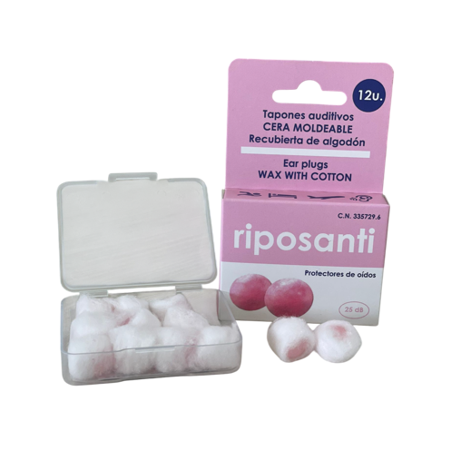 Tapones de cera moldeable para los oídos, de color rosa, que aíslan del agua, la humedad, el viento y el ruido. Estuche con 12 unidades.